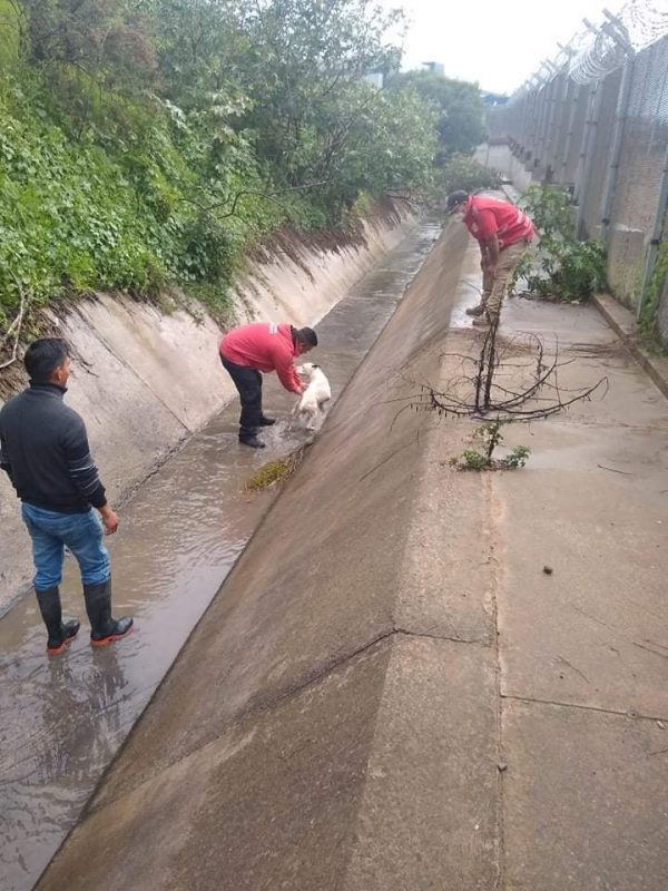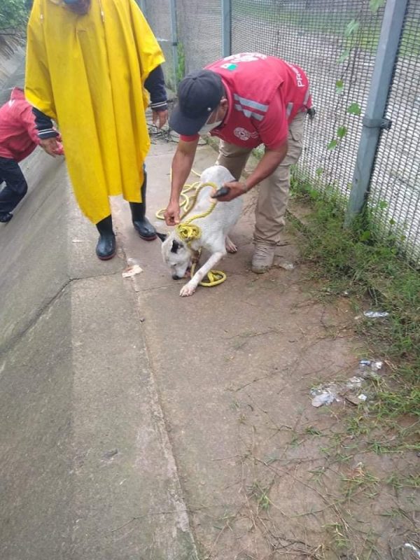 El canino de color blanco, no portaba collar, pero ya fue puesto a salvo sin que se le notaran lesiones, luego de haber sido arrastrado por el agua.