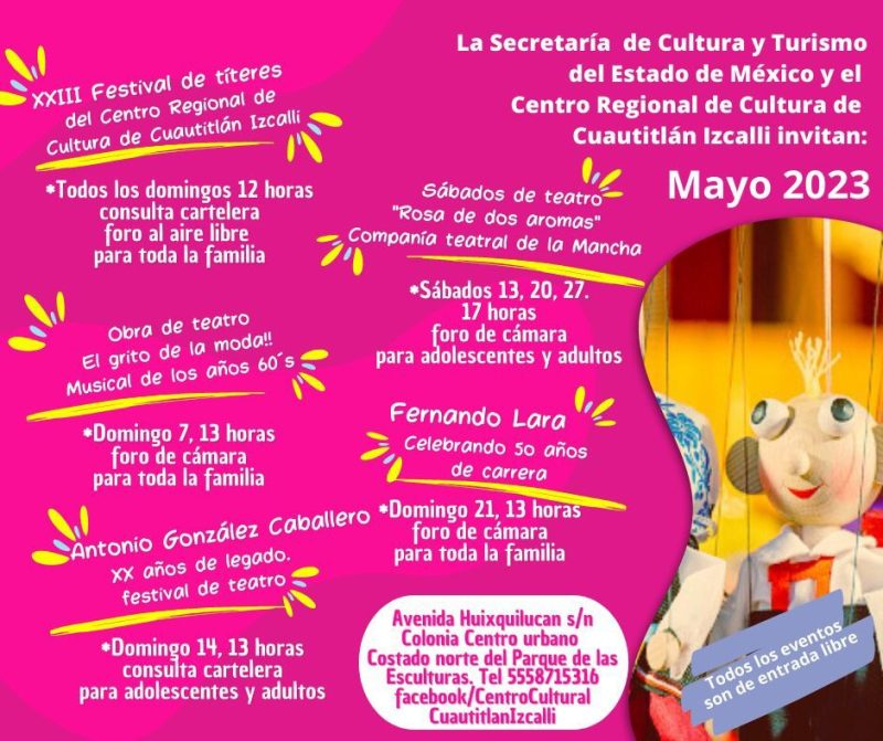 Celebraciones, títeres, festivales y teatro, es lo que prepararon este mes de mayo en el Centro Regional de Cultura de Cuautitlán Izcalli, para que tú y tu familia puedan pasar un excelente rato los próximos fines de semana.