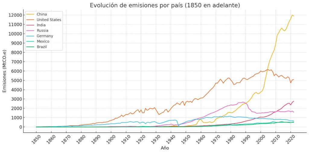 Según datos del World Resources Institute, China lidera las emisiones globales con casi 12 mil millones de toneladas de CO₂e. Le siguen Estados Unidos —que ha mostrado una tendencia a la baja desde la implementación del Protocolo de Kioto en 2005—, India con una curva ascendente, y Rusia con una tendencia más estable. Más abajo en la lista aparecen México y Brasil, los países latinoamericanos con mayor volumen de emisiones.