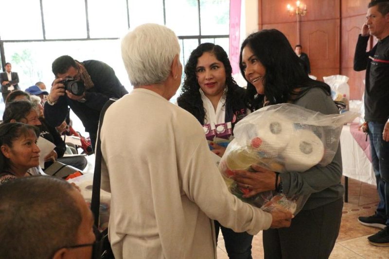 Las despensas contienen artículos de la canasta básica y fueron entregadas en el Salón Candiles por la Presidenta Municipal, Karla Fiesco García y la Presidenta del DIF, Jessica Jacqueline Villaseñor García.
