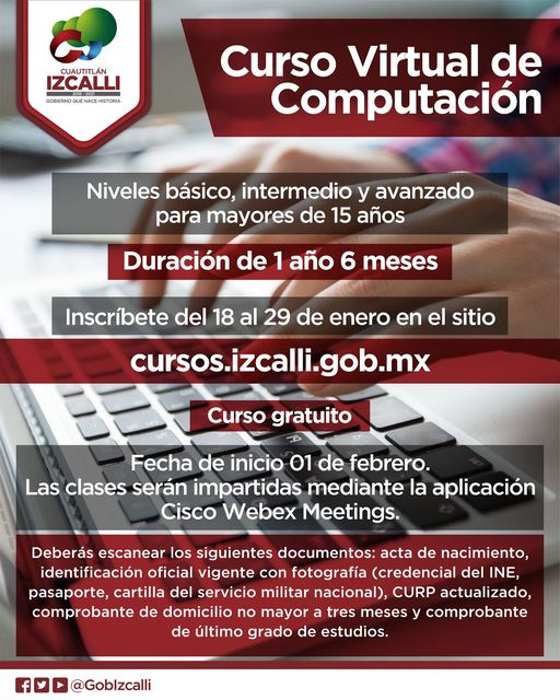 Gobierno, SliderAbre gobierno de Izcalli curso virtual gratuito de computaciónPor Redacción / 19 enero, 2021 No importa si no tienes conocimientos previos, pues se tendrán tres niveles: básico, intermedio y avanzado; aptos solamente para mayores